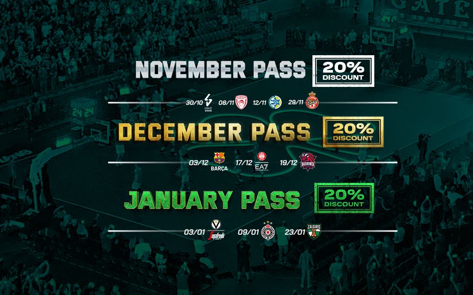Συγκεκριμένα, θα τεθούν σε κυκλοφορία τρία μηνιαία πακέτα εισιτηρίων, το November Pass, το December Pass και το January Pass, με τα οποία οι φίλαθλοί μας θα εξασφαλίζουν την παρουσία τους στο νέο και εντυπωσιακό ΟΑΚΑ, για όλους τους εντός έδρας αγώνες του εκάστοτε μήνα, επωφελούμενοι έκπτωσης 20%!