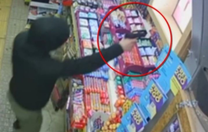 Όπως φαίνεται στο βίντεο, οι τρεις δράστες πλησιάζουν το περίπτερο και ένας εξ αυτών τραβάει πιστόλι στον υπάλληλο, απαιτώντας να του δώσει τα χρήματα του ταμείου, ενώ ένας από τους συνεργούς του φαίνεται να κρατά μαχαίρι.