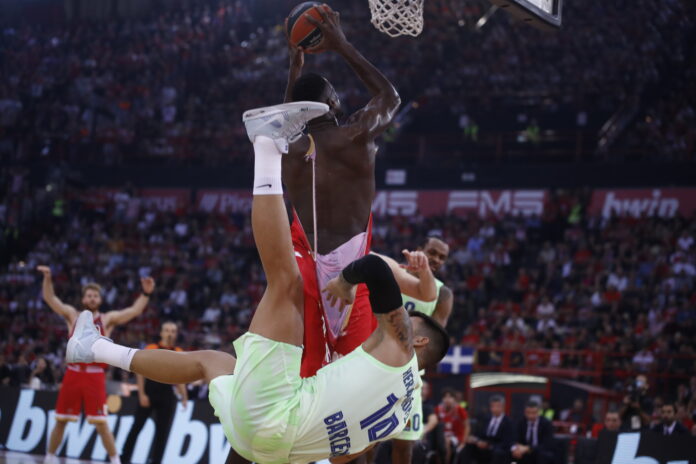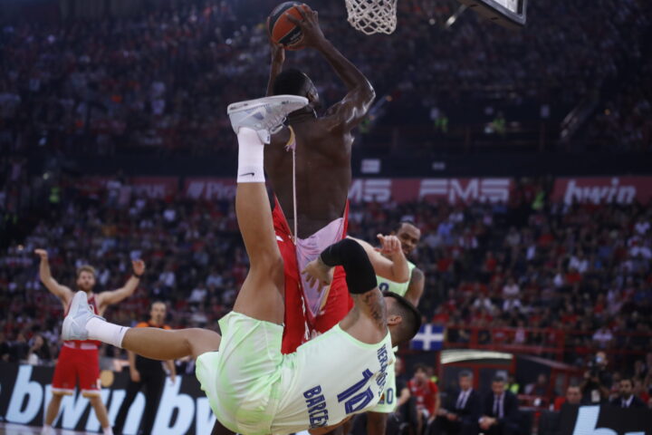 Λίγο πριν τη λήξη του αγώνα, ο Γουίλι Ερνάνγκομεθ της Μπάρτσα μάς χάρισε και την blooper στιγμή της αναμέτρησης στο Φάληρο, καθώς κρατήθηκε από τη φανέλα του Μουσταφά Φαλ πέφτοντας στη παρκέ -μετά την τρομερή προσποίηση του Γάλλου σέντερ- με αποτέλεσμα να την σκίσει και το ματς να διακοπεί για λίγα λεπτά για τον πιο ασυνήθιστο λόγο (έως ότου βρεθεί νέα φανέλα για τον θηριώδη άσο των Πειραιωτών).