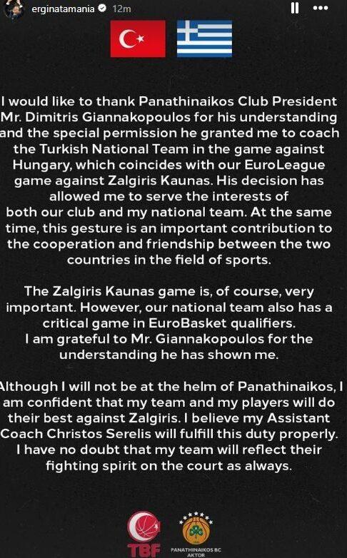 «Θα ήθελα να ευχαριστήσω τον πρόεδρο του Παναθηναϊκολυ, τον κ. Δημήτρη Γιαννακόπουλο, για την κατανόηση και την ειδική άδεια που μου έδωσε να κοουτσάρω την εθνική Τουρκίας στο παιχνίδι με την Ουγγαρία, το οποίο συμπίπτει με το παιχνίδι μας στην EuroLeague κόντρα στη Ζάλγκρις Κάουνας. Η απόφασή του μου επιτρέπει να υπηρετήσω τα συμφέροντα τόσο του κλαμπ μας, όσο και τη εθνικής μου ομάδας. Παράλληλα, η κίνηση αυτή συνεισφέρει σημαντικά στη συνεργασία και τη φιλία μεταξύ των δύο χωρών στο αγωνιστικό πλαίσιο.