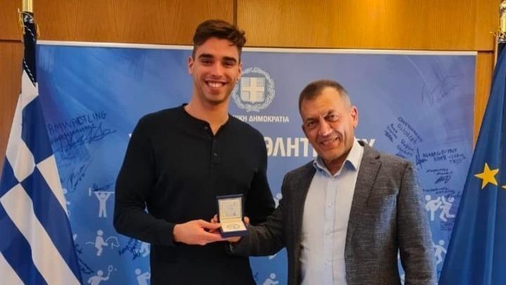 Ο αναπληρωτής υπουργός Αθλητισμού πρόσφερε συμβολικά στον Χρήστου το συλλεκτικό ασημένιο νόμισμα που εκδόθηκε για την επέτειο των 20 ετών από τους Ολυμπιακούς Αγώνες «Αθήνα 2004».