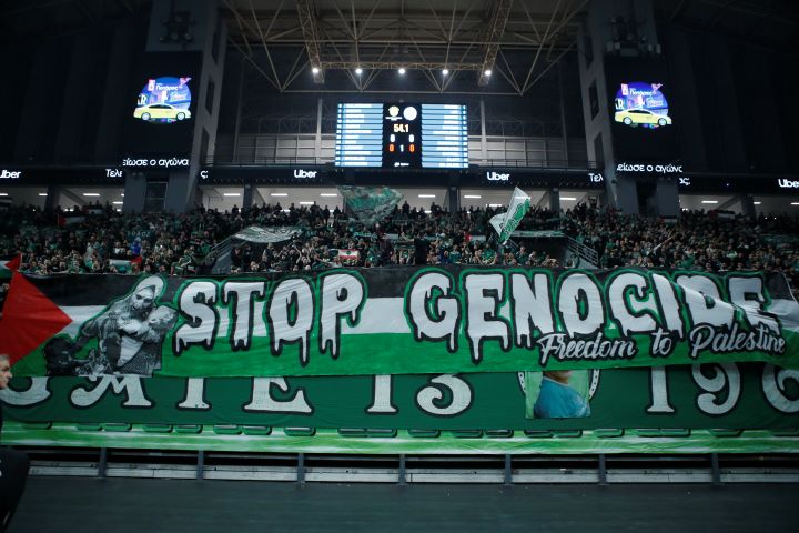 «Σταματήστε τη γενοκτονία», γράφει το μεγάλο πανό από τους οργανωμένους φίλους του Παναθηναϊκού στο ΟΑΚΑ, το οποίο είναι γεμάτο με σημαίες της Παλαιστίνης.