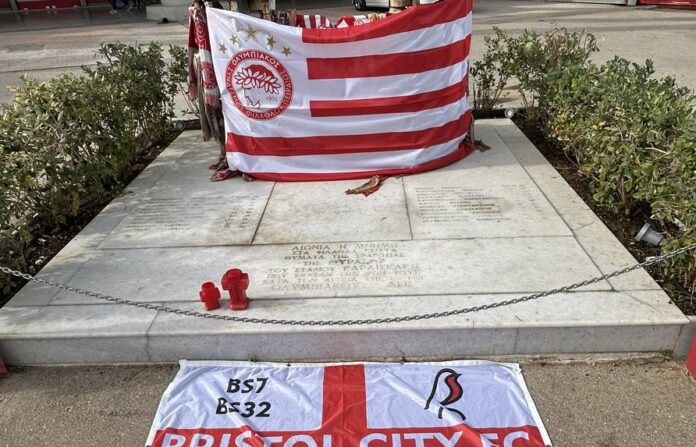 Οι οπαδοί της Μπρίστολ Σίτι άφησαν κάτω από το μνημείο μία αγγλική σημαία πάνω στην οποία αναγράφονταν τα ονόματά τους.