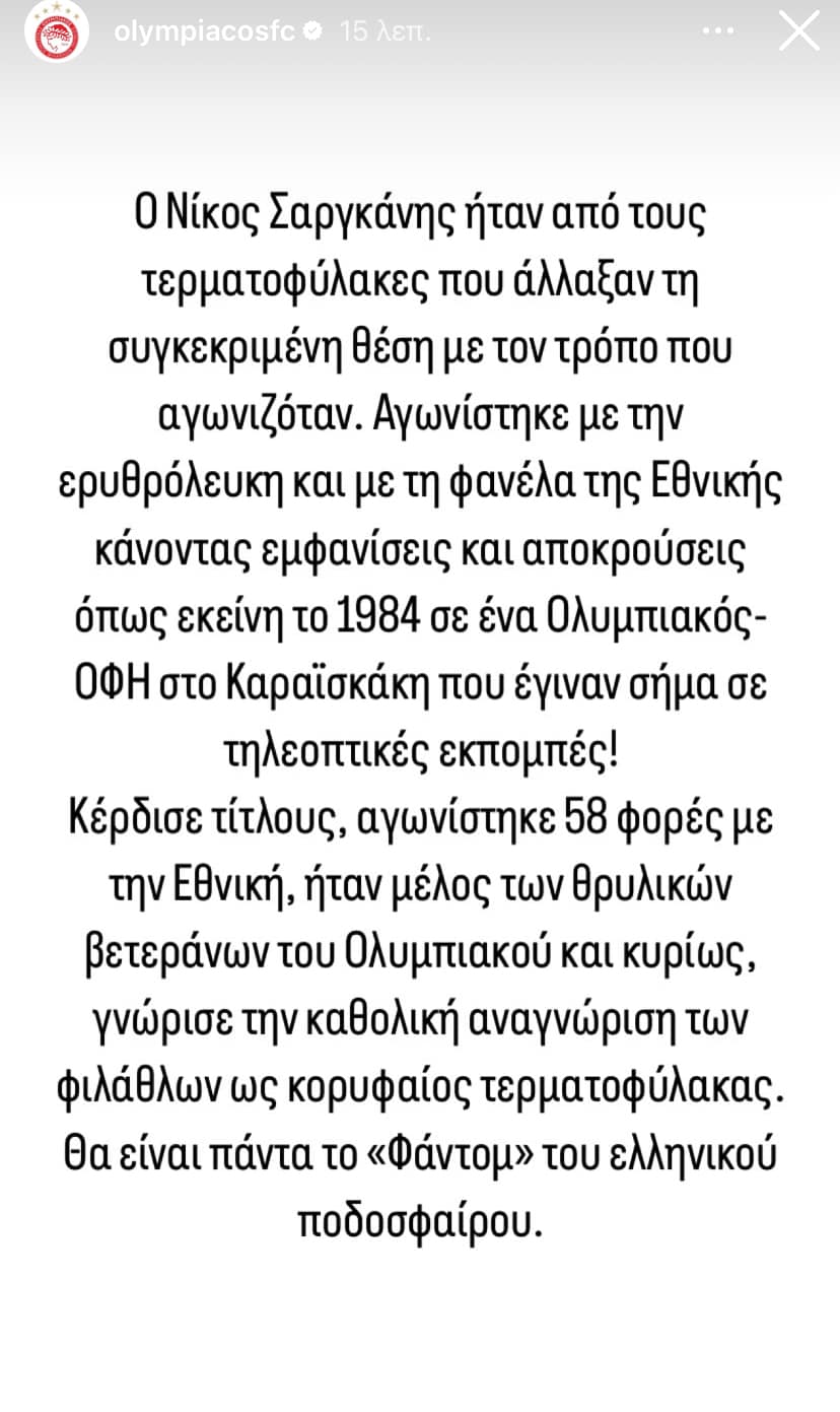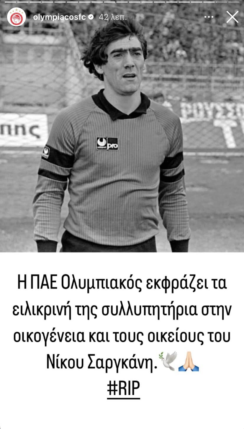 Η ερυθρόλευκη ΠΑΕ με συλλυπητήρια ανάρτησή της αποχαιρέτησε το παντοτινό «Φάντομ» του ελληνικού ποδοσφαίρου με λόγια τεράστιας εκτίμησης και αναφέροντας ενδεικτικά πως «ήταν από τους τερματοφύλακες που άλλαξαν τη συγκεκριμένη θέση με τον τρόπο που αγωνιζόταν και κέρδισε την καθολική αναγνώριση των φιλάθλων».