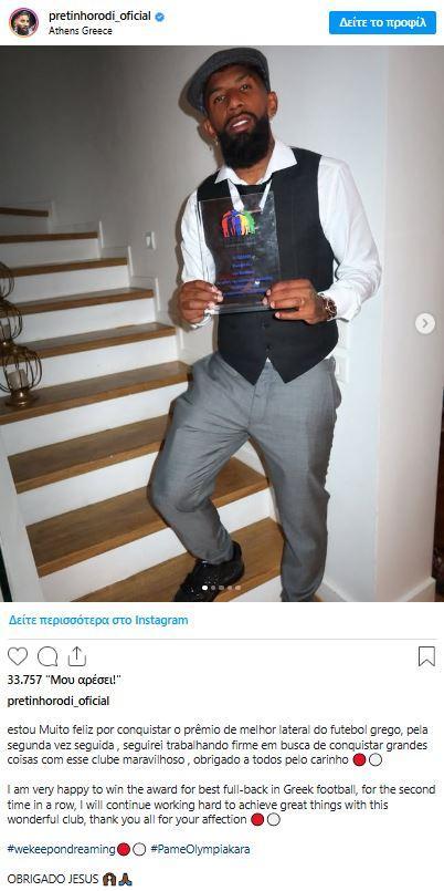 «Είμαι πολύ χαρούμενος που κέρδισα το βραβείο του καλύτερου δεξιού μπακ στην Ελλάδα για δεύτερη σερί σεζόν. Θα συνεχίσω να δουλεύω σκληρά για να πετύχω σπουδαία πράγματα με αυτή την υπέροχη ομάδα. Σας ευχαριστώ όλους για την αγάπη», ανέφερε στο μήνυμά του ο Βραζιλιάνος.