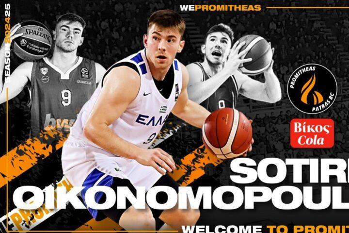 «Η ΚΑΕ Προμηθέας Πάτρας Βίκος Cola βρίσκεται στην ευχάριστη θέση να ανακοινώσει την απόκτηση του αθλητή Σωτήρη Οικονομόπουλου, ο οποίος εντάσσεται στο έμψυχο δυναμικό της ομάδας μας.