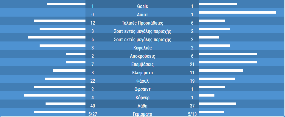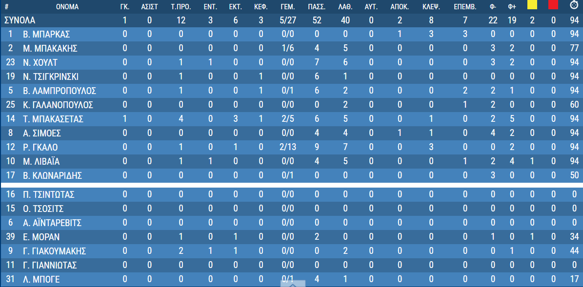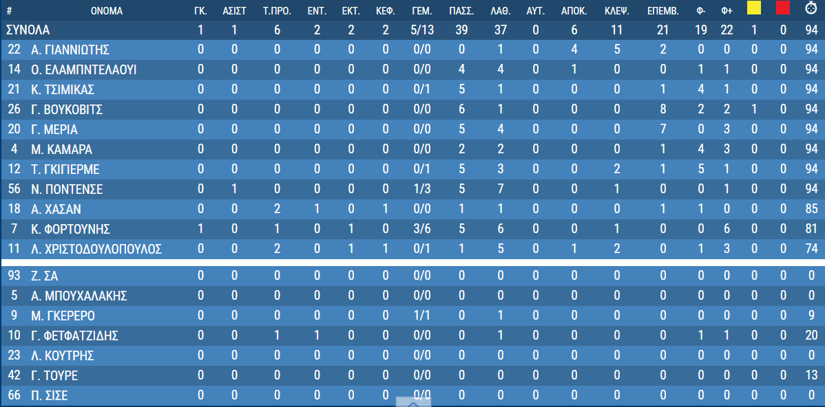 Δείτε στους παρακάτω πίνακες τη στατιστική απεικόνιση του ισόπαλου ντέρμπι του ΟΑΚΑ ανάμεσα στην ΑΕΚ και τον Ολυμπιακό.