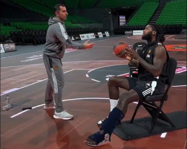Καθισμένος σε καρέκλα και με το αριστερό του πόδι σε μπότα, ο Γάλλος σέντερ έκανε κάποιες ασκήσεις με τη βοήθεια του βοηθού του Αταμάν, Σάββα Καμπερίδη, εκφράζοντας την ανυπομονησία του να επιστρέψει το συντομότερο δυνατό στο γήπεδο: