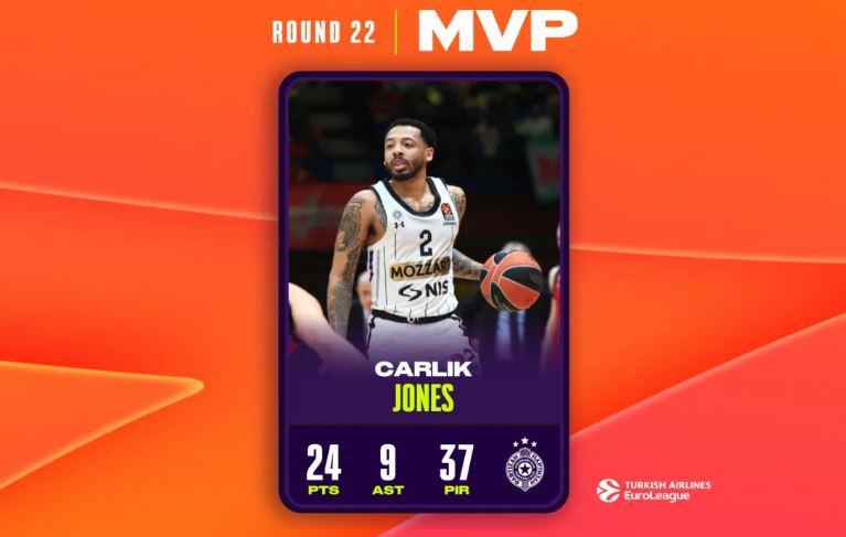 Το βραβείο του MVP στην 22η αγωνιστική της EuroLeague απέσπασε ο Κάρλικ Τζόουνς για πρώτη φορά στην καριέρα του.