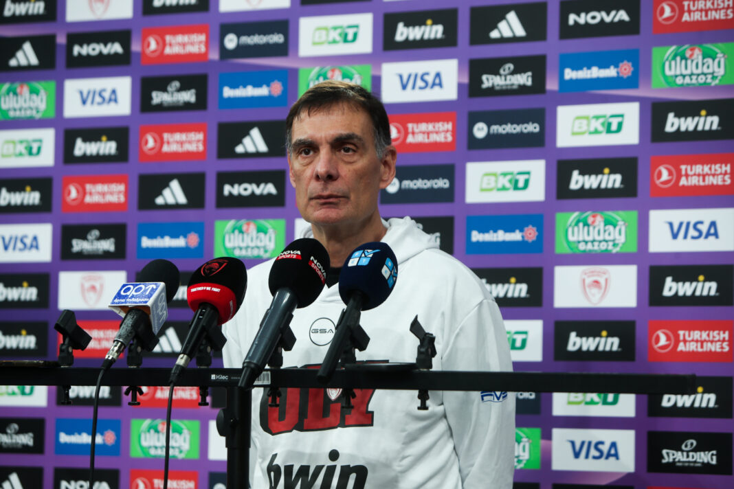 Αρχικά είπε: Καταρχήν δεν το βλέπουμε πως είναι ένας ανταγωνιστής για την πρώτη θέση. Αυτό είναι πέρα από τη δική μας λογική και φιλοσοφία. Εμείς κοιτάμε το επόμενο παιχνίδι και το κάνουμε εδώ και χρόνια. Δεν είναι κλισέ αυτό. Δεν ασχολούμαστε με την πρώτη θέση. Θέλουμε προφανώς να πάμε στα play off, θέλουμε να έχουμε πλεονέκτημα έδρας, αν είναι δυνατόν, αλλά είναι πολύ πρόωρο να πούμε ότι είναι μάχη για την πρώτη θέση. Κάθε ματς μετράει. Προερχόμαστε από σερί νικών στην Euroleague και γενικά έχουμε παίξει καλά το τελευταίο δίμηνο. Εδώ είναι ένα ιδιαίτερο παιχνίδι. Μια ομάδα που αμύνεται πολύ καλά πάνω στην μπάλα, που έχει πολύ σεταρισμένο τον τρόπο που αμύνεται και επιτίθεται, λόγω της φιλοσοφίας του προπονητή. Για εμάς είναι πολύ σημαντικό το flow σε αυτό το παιχνίδι, ο ρυθμός, να παίξουμε με ταχύτητα, να κυκλοφορήσουμε την μπάλα. Είναι σημαντικό να έχεις πολλές τελικές πάσες εναντίον τους, γιατί αν πας πολύ on ball δεν είσαι πρόβλημα. Άρα θα προσπαθήσουμε να το κάνουμε αυτό. Πιστεύουμε ότι θα παίξουμε καλύτερο από ότι στο παιχνίδι της Δευτέρας με τον Παναθηναϊκό. Αναλύσαμε το τι δεν κάναμε καλά, τα λάθη μας και νομίζω θα είμαστε έτοιμοι».