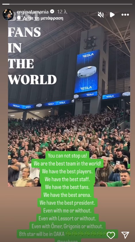 Ο Εργκίν Αταμάν που αποβλήθηκε με 3’18” να απομένουν για τη λήξη της τρίτης περιόδου, προχώρησε σε ανάρτηση στο Instagram το πρωί της Παρασκευής (24/1) και τόνισε πως κανείς δεν μπορεί να σταματήσει τους Πράσινους, καθώς είναι η καλύτερη ομάδα στον κόσμο, με το καλύτερο γήπεδο και τον καλύτερο πρόεδρο.