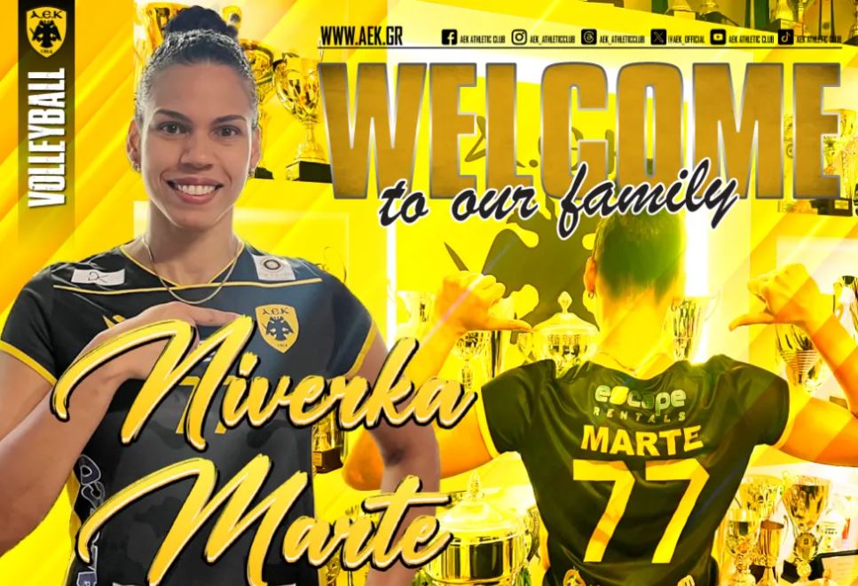 «H AEK βρίσκεται στην ευχάριστη θέση να ανακοινώσει την έναρξη της συνεργασίας της με την Νιβέρκα Μάρτε. Η Νιβέρκα είναι γεννημένη στις 19 Οκτωβρίου 1990, έχει ύψος 1,78 μ. και θα ενισχύσει το τμήμα Βόλεϊ Γυναικών του Συλλόγου.