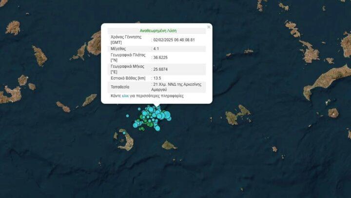 Ισχυρός σεισμός εντάσεως 4,1 Ρίχτερ σημειώθηκε λίγο πριν τις εννέα το πρωί της Κυριακής (2/02) στην θαλάσσια περιοχή της Αμοργού.