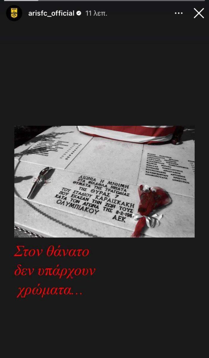 Όλοι οι «μεγάλοι» του ελληνικού ποδοσφαίρου τίμησαν τα θύματα της Θύρας 7, ανάμεσά τους και ο Άρης με μήνυμά του στο Instagram: «Στον θάνατο δεν υπάρχουν χρώματα» αναφέρουν οι Κίτρινοι.