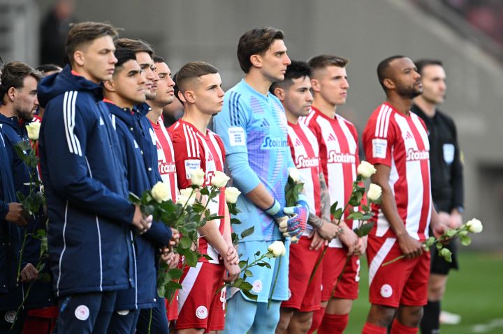 Οι ποδοσφαιριστές του Ολυμπιακού άφησαν και από ένα λουλούδι για τα θύματα πριν τη σέντρα.
