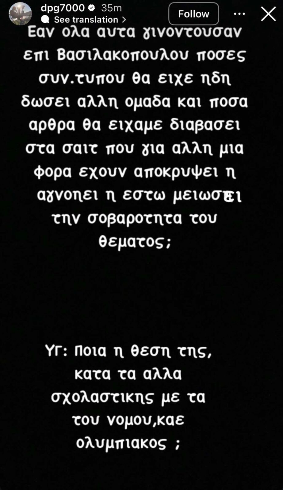 «Εάν όλα αυτά γινόντουσαν επί Βασιλακόπουλου, πόσες συνεντεύξεις Τύπου θα είχε ήδη δώσει άλλη ομάδα και πόσα άρθρα θα είχαμε διαβάσει στα σάιτ που για άλλη μία φορά έχουν αποκρύψει ή αγνοήσει ή έστω μειώσει την σοβαρότητα του θέματος;