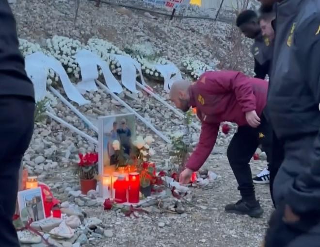 Παίκτες και τεχνικό επιτελείο απέτισαν φόρο τιμής στα θύματα, αφήνοντας 57 τριαντάφυλλα στο σημείο της τραγωδίας.