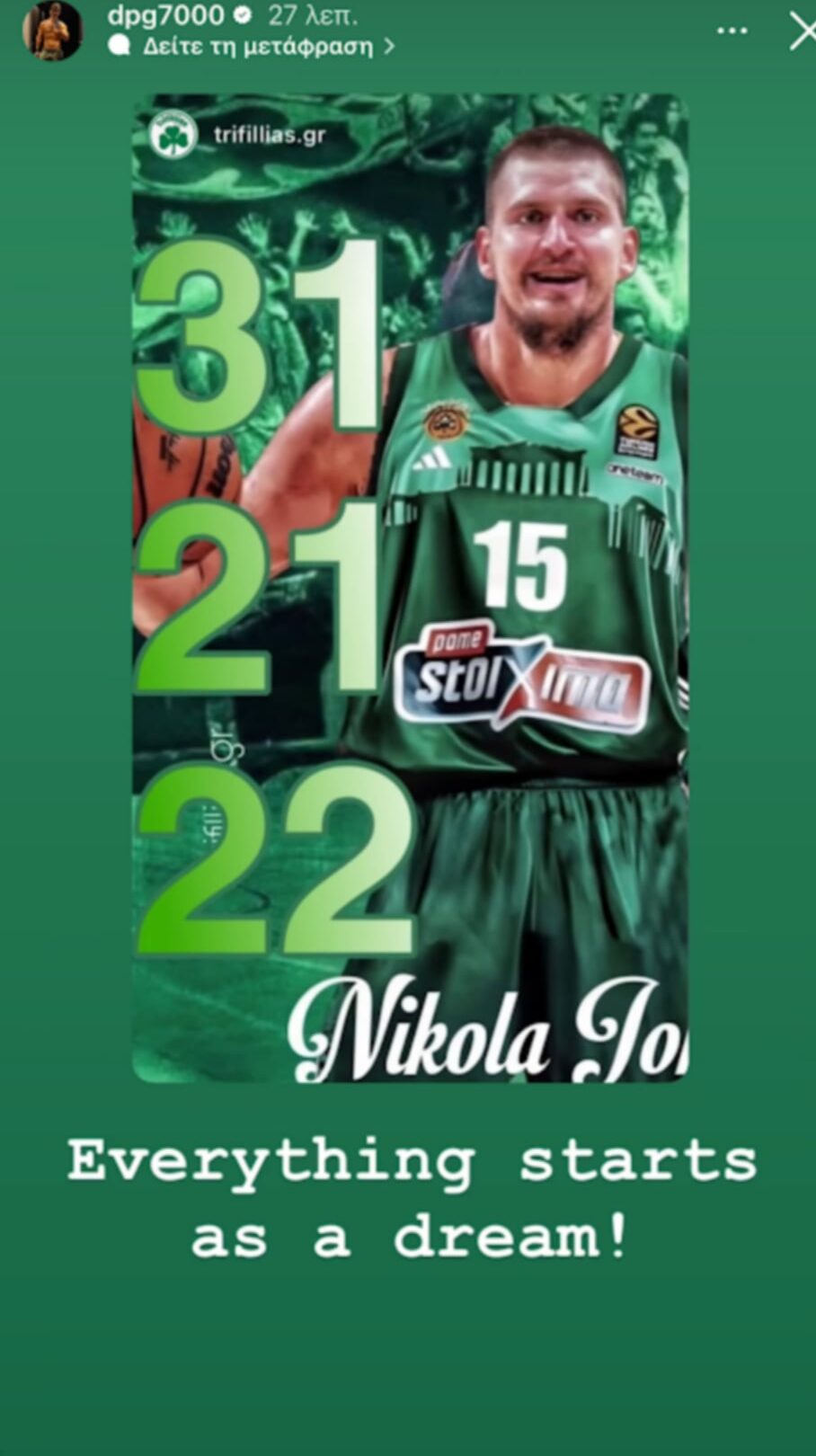 «Όλα ξεκινούν σαν ένα όνειρο», ενώ αυτή δεν ήταν η πρώτη φορά που έβαλε κάτι για Γιόκιτς καθώς τού έχει κάνει και… δημόσια πρόταση μέσω του instagram λογαριασμού του για να υπογράψει στο μέλλον στους Πράσινους.