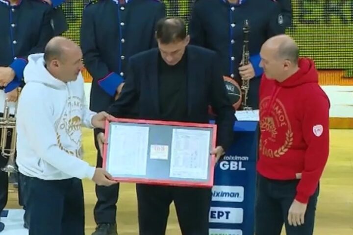 Παναγιώτης και Γιώργος Αγγελόπουλος βράβευσαν τον Γιώργο Μπαρτζώκα σε μία όμορφη στιγμή στο ΣΕΦ πριν την έναρξη του αγώνα με τον Κολοσσό για την 20η αγωνιστική της GBL.