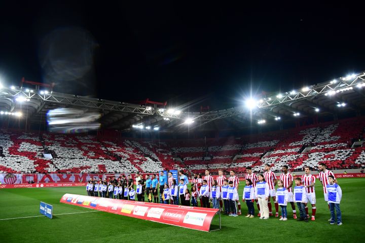 Ανατριχιαστικές στιγμές στο «Γ. Καραϊσκάκης» με την είσοδο των ποδοσφαιριστών του Ολυμπιακού και του ΟΦΗ στον αγωνιστικό χώρο.