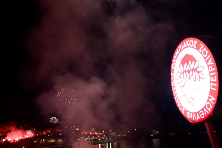 Καπνογόνα, πυροτεχνήματα και βεγγαλικά έντυσαν τον ουρανό της Αττικής με τους φίλους του Ολυμπιακού να δημιουργούν μια ασύλληπτη ατμόσφαιρα έξω από το ερυθρόλευκο Δημοτικό Θέατρο Πειραιά αλλά και στην Ακρόπολη.