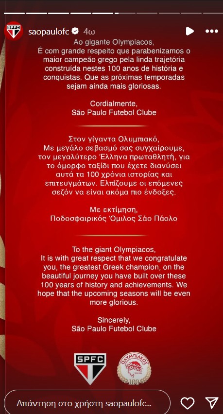 Το μεγαλείο του Ολυμπιακού φτάνει μέχρι τη Βραζιλία και ακόμη παραπέρα. Η Σάο Πάολο με ένα τρομερό μήνυμα ευχήθηκε στο μεγαλύτερο αθλητικό και κοινωνικό φαινόμενο της Ελλάδας.