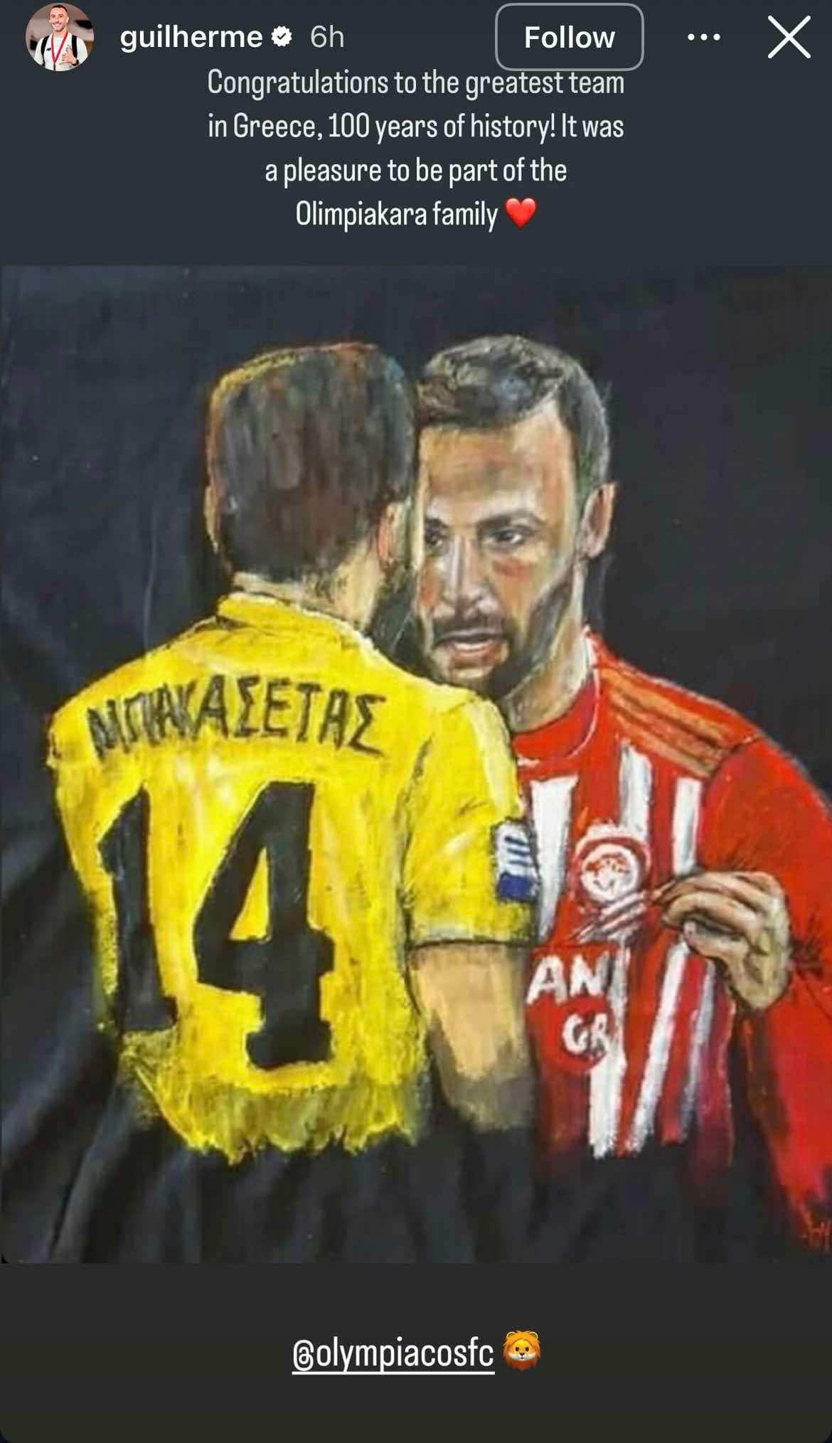 «Συγχαρητήρια στη μεγαλύτερη ομάδα στην Ελλάδα, 100 χρόνια ιστορίας. Ήταν χαρά να είμαι μέρος της οικογένειας της Ολυμπιακάρας», έγραψε ο Βραζιλιάνος μέσος που συνόδευσε την ευχή του με ένα εικαστικό από ένα ντέρμπι με την ΑΕΚ όπου έδειξε το σήμα του Ολυμπιακού στον τότε ποδοσφαιριστή της Ένωσης, Τάσο Μπακασέτα.