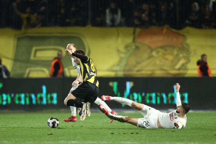 Για την κόκκινη του Σίμου Μήτογλου: «Εδώ ο παίκτης με το νούμερο 24 της ΑΕΚ χωρίς να διεκδικεί την μπάλα διακινδυνεύει την ασφάλεια του αντίπαλού του, κάνοντας τάκλιν από πίσω με μεγάλη ταχύτητα, μεγάλη ένταση, χτυπώντας τον στον αστράγαλο. Ο διαιτητής έδειξε άμεσα την κόκκινη κάρτα την οποία επιβεβαίωσε μετά από επισκόπηση μέσω VAR. Καθαρή κόκκινη κάρτα για βίαιη επαφή».