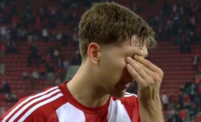 Ο αρχηγός του Ολυμπιακού όντας συναισθηματικά φορτισμένος, βούρκωσε την ώρα που έκανε δηλώσεις στο φινάλε του αγώνα, ευχαριστώντας τον κόσμο για τη στήριξη.