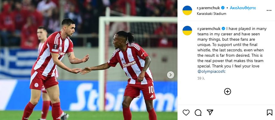 «Έχω παίξει σε πολλές ομάδες στην καριέρα μου και έχω δει πολλά πράγματα αλλά αυτοί οι οπαδοί είναι μοναδικοί. Να υποστηρίζεις ως το τελευταίο σφύριγμα, τα τελευταία δευτερόλεπτα, ακόμα κι όταν το αποτέλεσμα είναι μακριά από το επιθυμητό. Αυτή είναι η πραγματική δύναμη που κάνει αυτόν τον σύλλογο ιδιαίτερα. Σας ευχαριστώ, νιώθω την αγάπη σας», έγραψε ο Ουκρανός στο instagram.