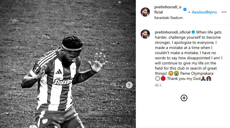 «Όταν η ζωή γίνεται δυσκολότερη, προκάλεσε τον εαυτό σου να γίνει πιο δυνατός. Ζητώ συγγνώμη από όλους, έκανα λάθος τη στιγμή που δεν μπορούσα να κάνω λάθος, δεν έχω λόγια να πω πόσο απογοητευμένος είμαι! Θα συνεχίσω να δίνω τη ζωή μου στο γήπεδο για αυτό το κλαμπ αναζητώντας σπουδαία πράγματα! Πάμε Ολυμπιακάρα, σε ευχαριστώ Θεέ μου», έγραψε στο instagram ο Βραζιλιάνος.