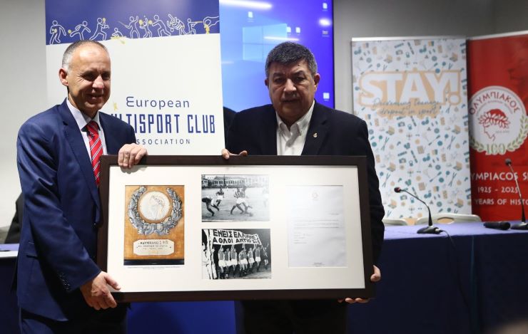 Με ιδιαίτερη επιτυχία ολοκληρώθηκε η Γενική Συνέλευση της Ευρωπαϊκής Ομοσπονδίας Πολυαθλητικών Σωματείων (EMCA), η οποία πραγματοποιήθηκε στον Πειραιά, με το Στάδιο Ειρήνης και Φιλίας να φιλοξενεί το σύνολο των εργασιών. Κατά τη διάρκεια της δεύτερης ημέρας της συνέλευσης, ο Ολυμπιακός Σ.Φ.Π. τιμήθηκε με ένα ιδιαίτερα σημαντικό βραβείο για τα 100 χρόνια της ομάδας μας, που συμπληρώνονται φέτος, αναγνωρίζοντας την αδιαμφισβήτητη συνεισφορά του στην ανάπτυξη του πολυαθλητισμού σε ευρωπαϊκό επίπεδο.
