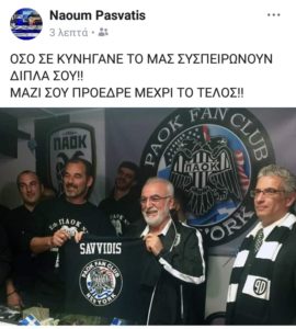 «Όσο σε κυνηγούν, μας συσπειρώνουν δίπλα σου. Μαζί σου ως το τέλος πρόεδρε», συνοδεύοντας την ανάρτηση από μια φωτογραφία του με τον Ιβάν Σαββίδη, όταν ο μεγαλομέτοχος του Δικεφάλου είχε επισκεφθεί τον σύνδεσμο, στα πλαίσια της παρουσίας του στην Αμερική.