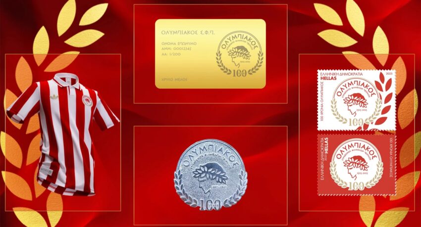 ☑️ Την αναμνηστική Σειρά Γραμματοσήμων «100 Χρόνια Ολυμπιακός» με απεικόνιση τον Δαφνοστεφανωμένο Έφηβο, που περιλαμβάνει επίσης Φάκελο Πρώτης Ημέρας Κυκλοφορίας.