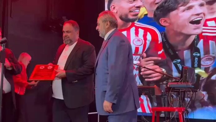 Ο σύνδεσμος φιλάθλων Ολυμπιακού Νέας Υόρκης τίμησε τον πρόεδρο του Ολυμπιακού, Βαγγέλη Μαρινάκη για την κατάκτηση του Conference League και του UEFA Youth League στον χορό που διοργανώθηκε για τον εορτασμό των 100 χρόνων.