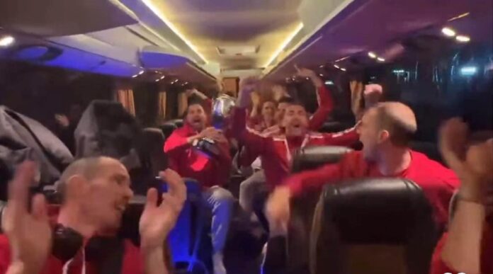 «Είσαι στο μυαλό κάτι μαγικό», ξεκίνησε να τραγουδά ο Σέρβος διαγώνιος με τους υπόλοιπους παίκτες του Ολυμπιακού να τον ακολουθούν.