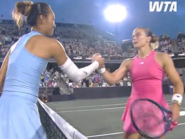 Η Ελληνίδα πρωταθλήτρια ηττήθηκε με 6-4, 6-1, μετά από μια ώρα και 32 λεπτά, από την Κινέζα αντίπαλό της, Νο 8 στον κόσμο και αποκλείστηκε από το 500άρι τουρνουά των ΗΠΑ, στο πρώτο της φετινό παιχνίδι στο χώμα.