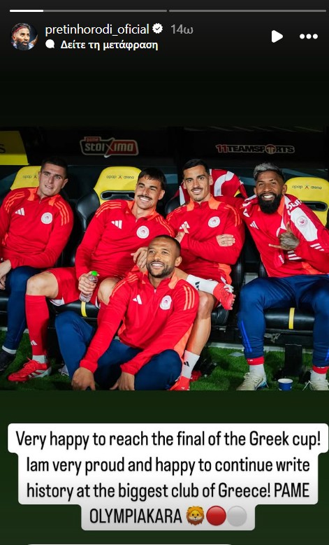«Πολύ χαρούμενος που προκριθήκαμε στον τελικό του Κυπέλλου Ελλάδος. Είμαι πολύ περήφανος και χαρούμενος που συνεχίζω να γράφω ιστορία για τον μεγαλύτερο σύλλογο της Ελλάδας. Πάμε Ολυμπιακάρα», έγραψε δημοσιεύοντας φωτογραφία του μαζί με τους Ελ Κααμπί, Πιρόλα, Γκαρθία και Τσικίνιο.