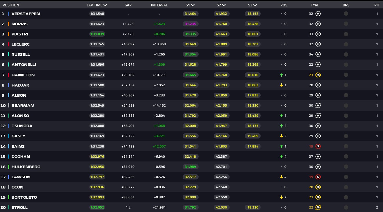 Ο Ολλανδός πρωταθλητής της Red Bull έδειξε ανίκητος από το ξεκίνημα και παρά τις αντιξοότητες κράτησε τη μεγάλη απόσταση από τις McLaren των Νόρις και Πιάστρι που τον ακολούθησαν στη 2η και στην 3η θέση αντίστοιχα, ενώ τέταρτος τερμάτισε ο Λεκλέρ για τη Ferrari που είδε τον Χάμιλτον να απογοητεύει ξανά με την 7η θέση.