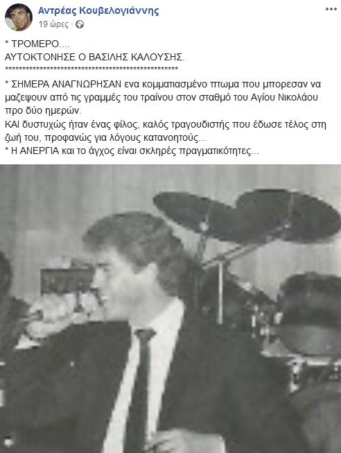 Πρόκειται για τον τραγουδιστή Βασίλη Καλούση. Την αποκάλυψη έκανε με ανάρτησή του στο Facebook ο δημοσιογράφος Ανδρέας Κουβελογιάννης. Όπως αποκάλυψε, ο δημοσιογράφος, ο Βασίλης Καλούσης έδωσε τέλος στην ζωή του γιατί δεν άντεχε να υπομένει μια σκληρή για τον ίδιο πραγματικότητα.