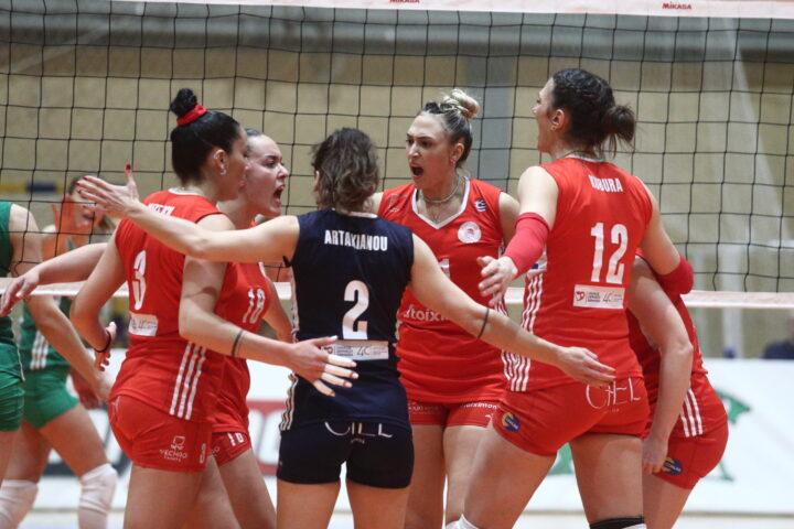 Οι Ερυθρόλευκες ήταν κυρίαρχες από το πρώτο σετ στο οποίο προηγήθηκαν μέχρι και με 12-3, με 9 μπλοκ και 6 άσους δεν άφησαν περιθώρια μέχρι το τέλος στις Πράσινες με φόντο ένα ακόμη τρόπαιο και το ιστορικό τρεμπλ μετά την κατάκτηση του Σούπερ Καπ και του Κυπέλλου νωρίτερα στην τρέχουσα σεζόν.