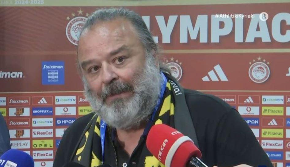 «Να βαράνε τραμπούκοι, να βαράνε παίκτες. Άλλο να τσακώνονται παίκτες μεταξύ τους και άλλο τραμπούκοι ιδιώτες χωρίς να είναι παίκτες. Χτυπήσανε δύο παίκτες μας, τον Ρότα και τον Κοϊτά οι οποίοι το κατήγγειλαν. Μάλιστα ο ένας έχει μπουνιές στο κεφάλι. Νομίζω ότι είναι τραγικό, το ποδόσφαιρο ξαναγυρίζει πίσω. Εκεί που προσπαθούμε να βάλουμε μία ρότα το ποδόσφαιρο ξαναγυρίζει πίσω. Είναι αίσχος, είναι ντροπή, είναι βούρκος, είναι τραμπουκισμοί, είναι αλητεία. Λυπάμαι που το ποδόσφαιρο σήμερα έχει τέτοια πράγματα. Δεν έχω τι άλλο να πω. Για το παιχνίδι όλοι είδατε ότι ήταν ένα παιχνίδι κορώνα-γράμματα. Αν είχε βάλει πρώτος το γκολ ο Μάνταλος θα ήταν διαφορετικά τα πράγματα. Λυπάμαι για αυτή την κατάντια και αυτή τη ντροπή του ελληνικού ποδοσφαίρου. Σκέφτομαι να κάτσω πολύ σοβαρά να ηρεμήσω και να σκεφτώ τι πρέπει να γίνει με την αθλητική βία και τους τραμπουκισμούς»