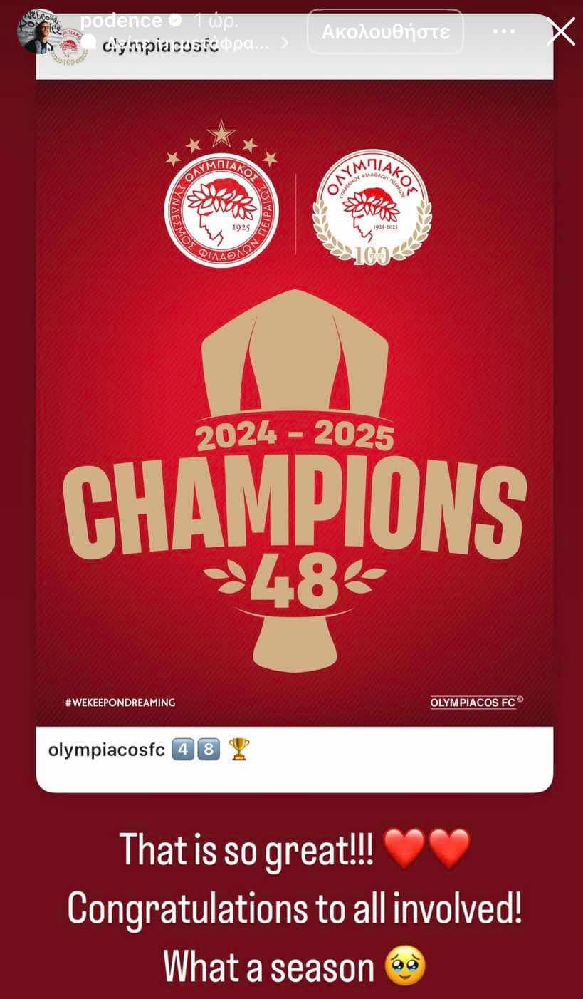 Ο Ντάνιελ Ποντένσε δεν ξεχνά τον Ολυμπιακό και πανηγυρίζει κι αυτός για την κατάκτηση του 48ου πρωταθλήματος Ελλάδας από τους Πειραιώτες.