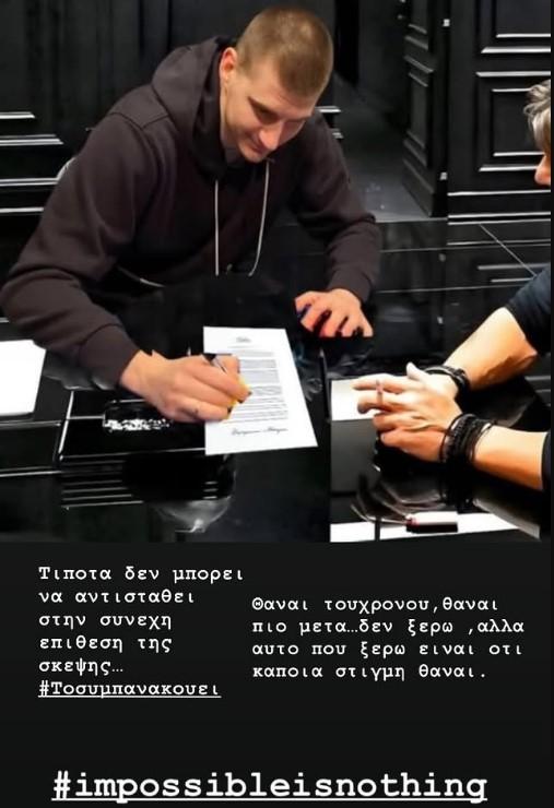 Το επανέλαβε και με σημερινό του story στο Instagram, με μία ακόμα «φτιαγμένη» φωτογραφία του Σέρβου σταρ, αυτή τη φορά να υπογράφει το συμβόλαιό του στο πλάι του ισχυρού άνδρα του Παναθηναϊκού.
