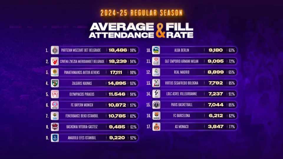 Παρτιζάν και Ερυθρός Αστέρας καταλαμβάνουν τις δύο πρώτες θέσεις με τον Παναθηναϊκό του ανακαινισμένου ΟΑΚΑ να είναι τρίτος με 17.111 θεατές κατά μέσο όρο (90% ποσοστό στη συνολική προσέλευση) και αύξηση 17.5% σε σύγκριση με τη σεζόν 2023/24.