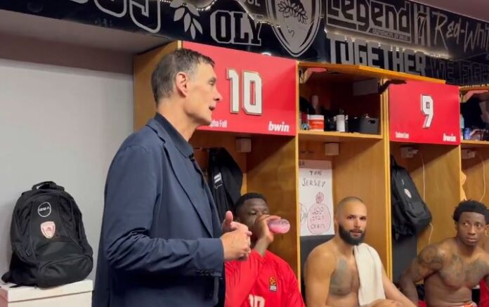 «Παιδιά, δεν έχω πολλά να σας πω. Απλά συγχαρητήρια. Η άμυνά μας ήταν συμπαγής. Καταφέραμε να κερδίσουμε αυτό το παιχνίδι, ήταν μια εκπληκτική εμφάνιση ειδικά μετά την πρώτη περίοδο στο κομμάτι της άμυνας. Συγχαρητήρια. Ακούστε: Τίποτα δεν έχει τελειώσει, ένα παιχνίδι τη φορά», είπε στους παίκτες του ο κόουτς του Ολυμπιακού.