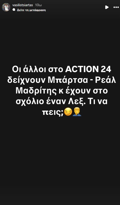 Συγκεκριμένα ο παλαίμαχος διεθνής ποδοσφαιριστής τόνισε: «Οι άλλοι στο Action 24 δείχνουν Μπάρτσα – Ρεάλ κι έχουν στο σχόλιο έναν Λεξ. Τι να πεις;».