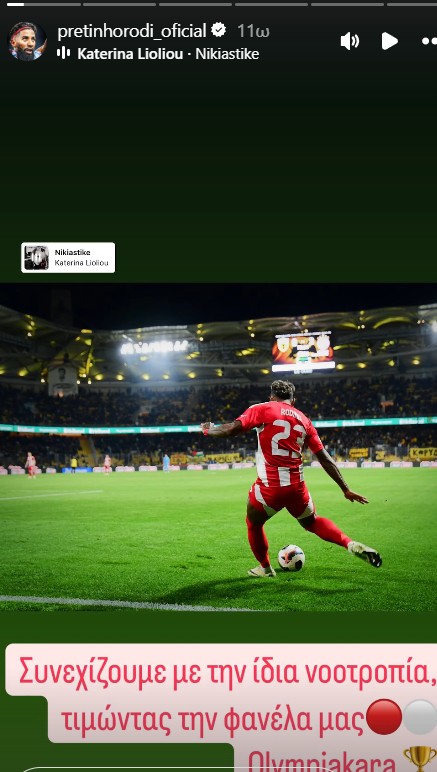 «Συνεχίζουμε με την ίδια νοοτροπία, τιμώντας τη φανέλα μας. Ολυμπιακάρα», έγραψε ο Ροντινέι.