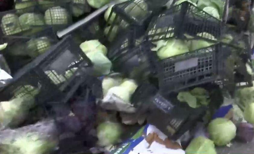 Στο σημείο βρίσκονται συνεργεία για να απομακρύνουν τα λάχανα προκειμένου στη συνέχεια να δοθεί ο δρόμος στην κυκλοφορία.