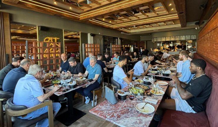 Διοίκηση, προπονητικό επιτελείο και παίκτες έκαναν το δικό τους… ποδαρικό στο σύγχρονο εστιατόριο του Αμερικανού φόργουορντ και γιόρτασαν σε χαλαρό κλίμα την τέταρτη διαδοχική πρόκριση στο Final Four της EuroLeague.